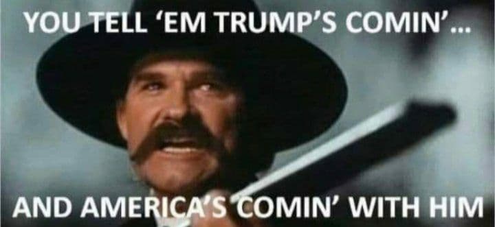 Wenn er dann noch Zeit findet, kümmert er sich vielleicht auch gemeinsam mit Wladimir Putin um einen Friedensvertrag für Deutschland. In einer seiner letzten Wahlkampfreden hatte er schon angekündigt, mal nach Deutschland gehen zu wollen und denen einiges zu erklären...